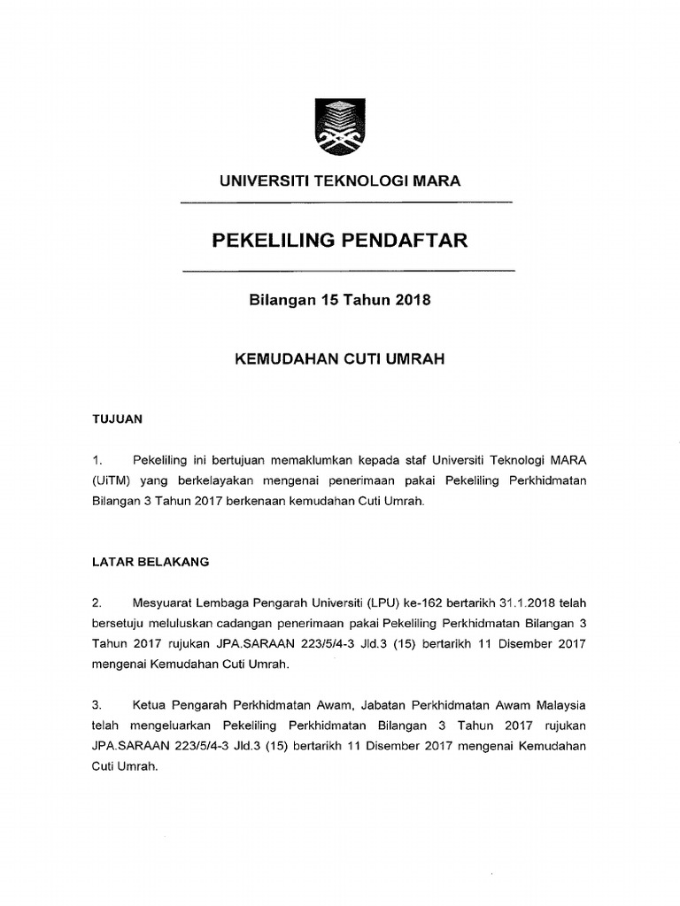Pekeliling Pendaftar Bil.15 Tahun 2018 - Kemudahan Cuti Umrah